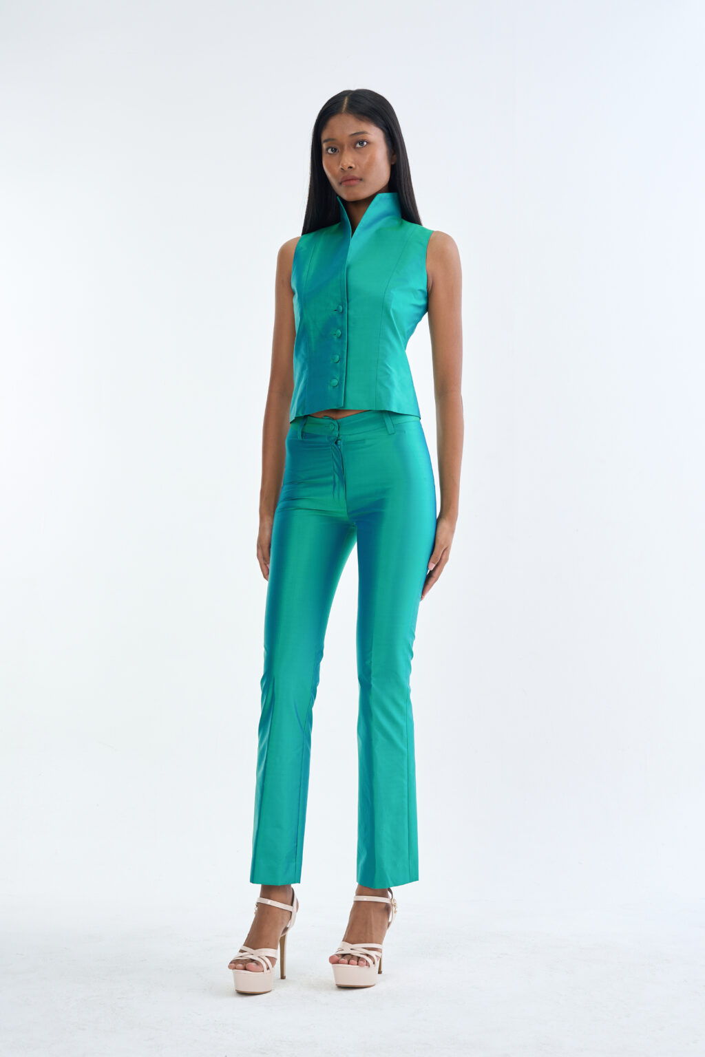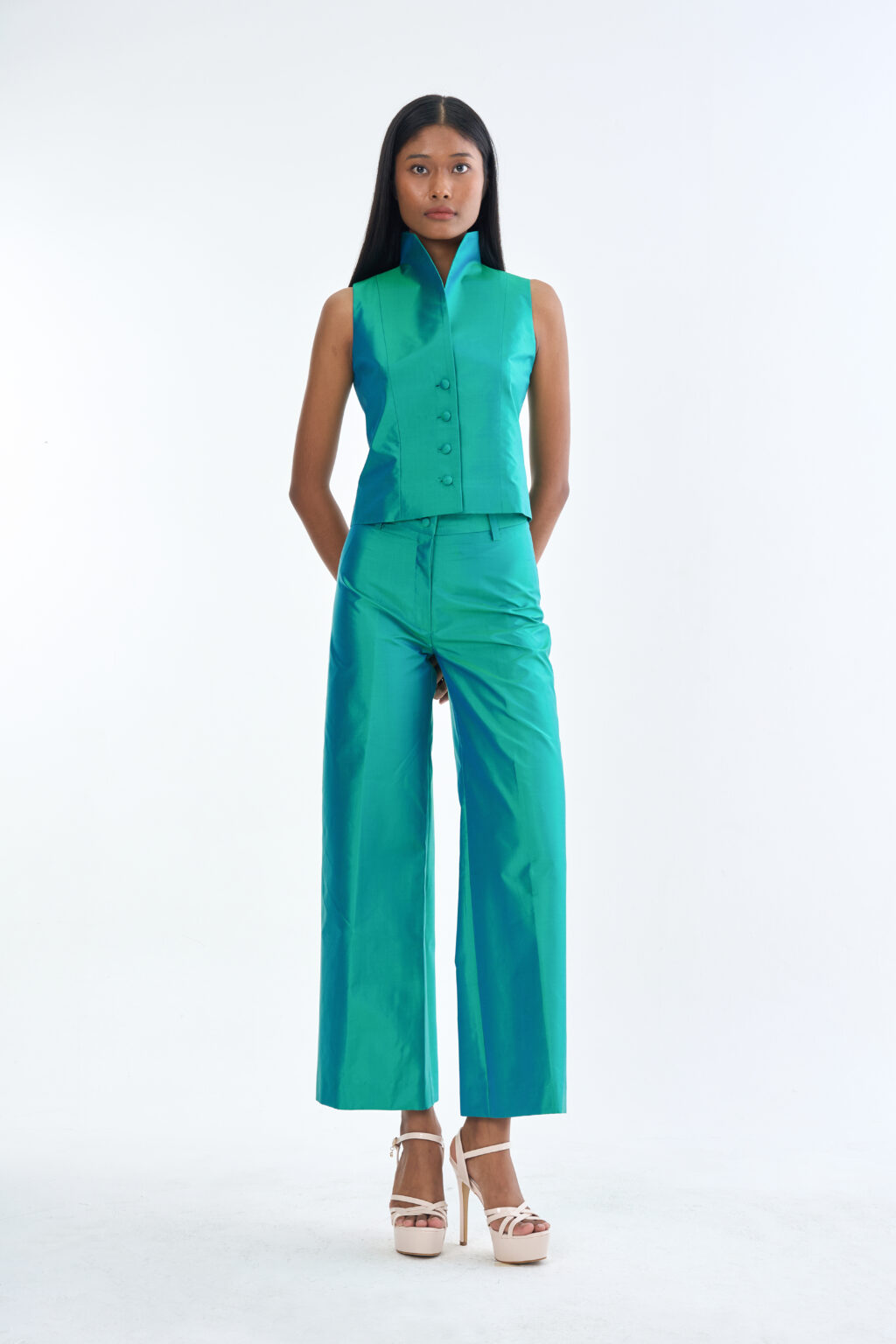 Emerald Wing Collar Sleeveless Tops with Long Pants